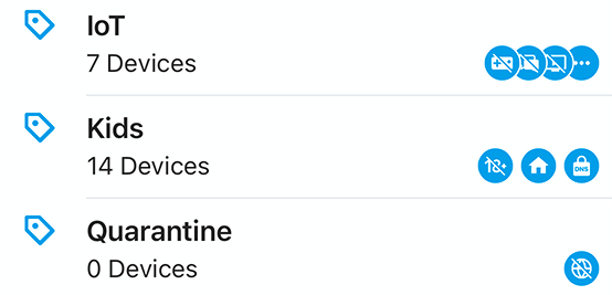 When you apply certain features or block specific categories, each device (or group/user) will display an icon on the Device List to indicate which controls are applied.