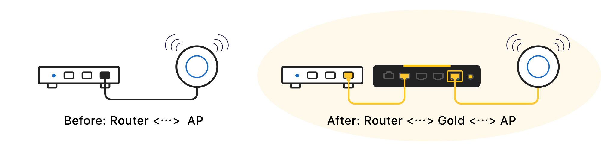 Router <-> Firewalla <-> Wi-Fi access points or switches