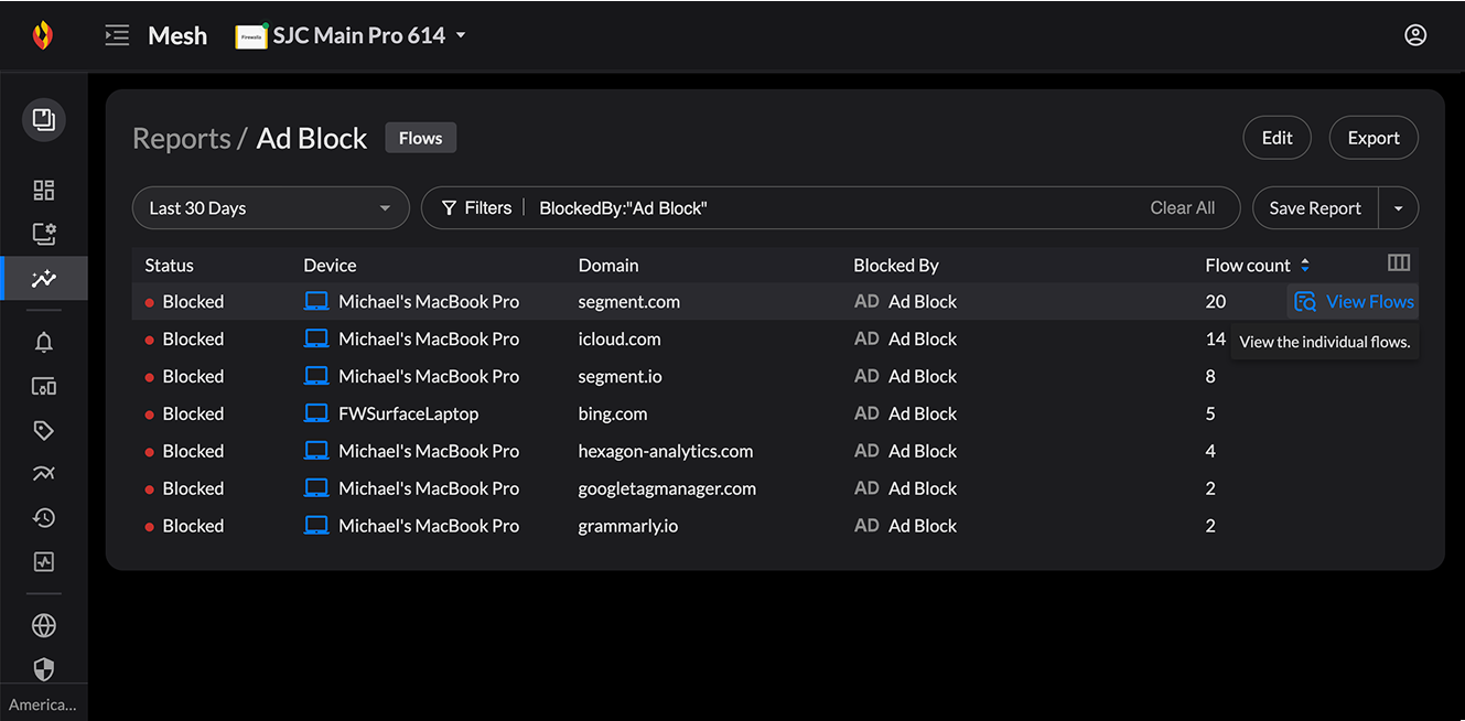 - Identify flows by device. For example, if you're trying to monitor the activity of a specific device, you can tap Devices > your device > Network Flows to narrow down the data to just the flows going to and from that device.