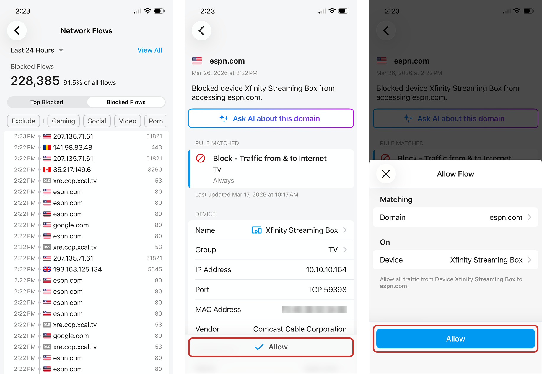 Similarly, if you're finding that your devices can't open an app or website they need to access, you can use Firewalla's Blocked Flows to find the blocked destinations and allow them. For example, here's how you can use flows to allow a device with restricted Internet access to use ESPN: