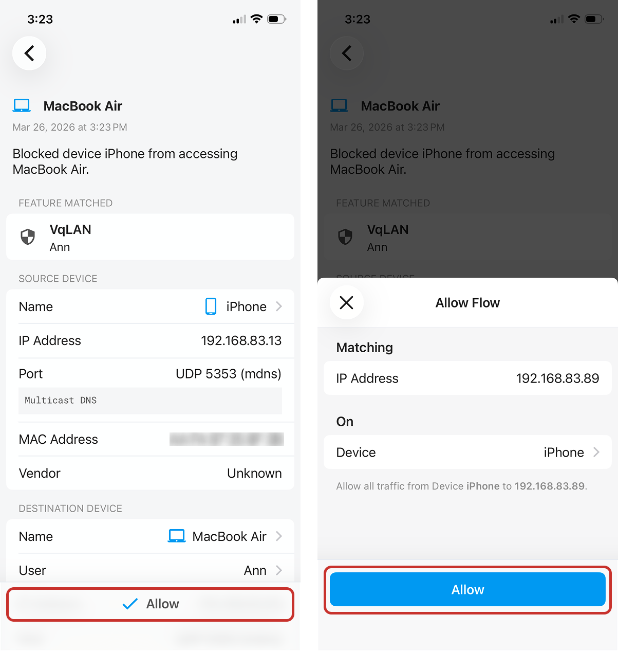 - Tap Allow. It'll display the device name and the IP address that you'd like to allow local flows to. You can change the scope to be the entire group/user, network, or all devices.