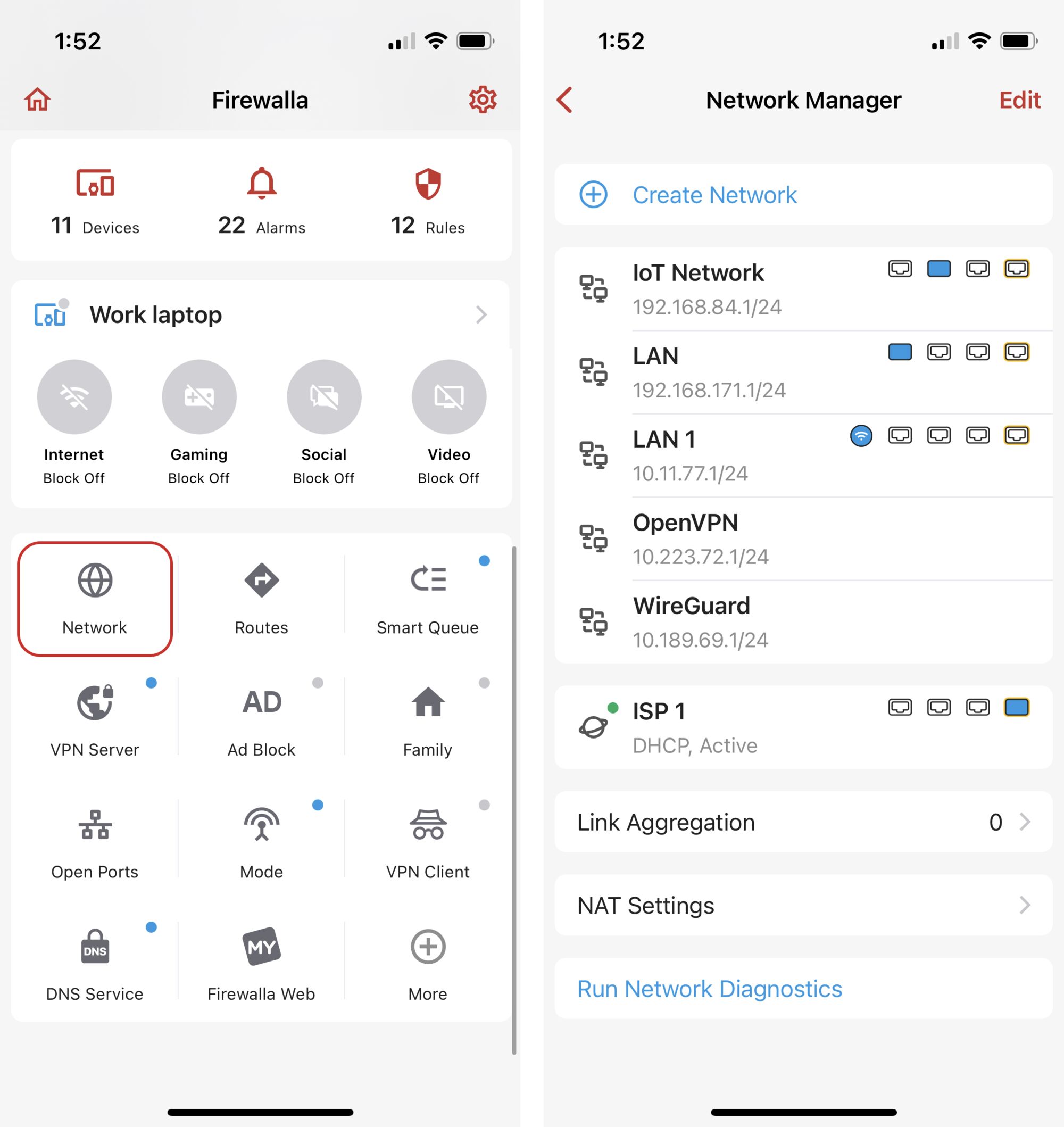 Firewalla's Network Manager makes it easy to view, manage, and create LANs and WANs.