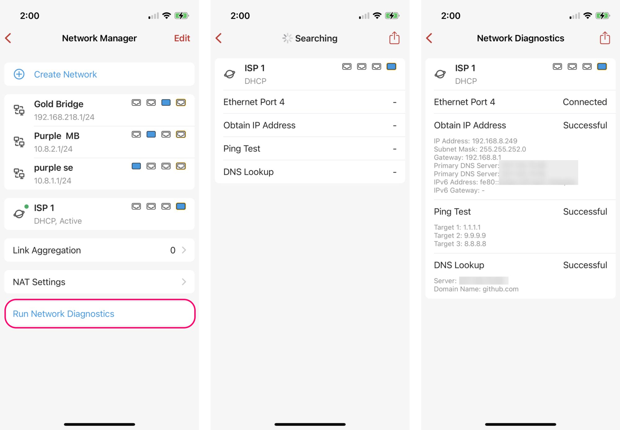 If you're running into issues with your Internet connection, you can manually run network diagnostics to see if your WANs are the problem. This means you can diagnose your connection anytime, even if Firewalla hasn't reported any errors. To do this, tap Run Network Diagnostics at the bottom of the Network Manager page.