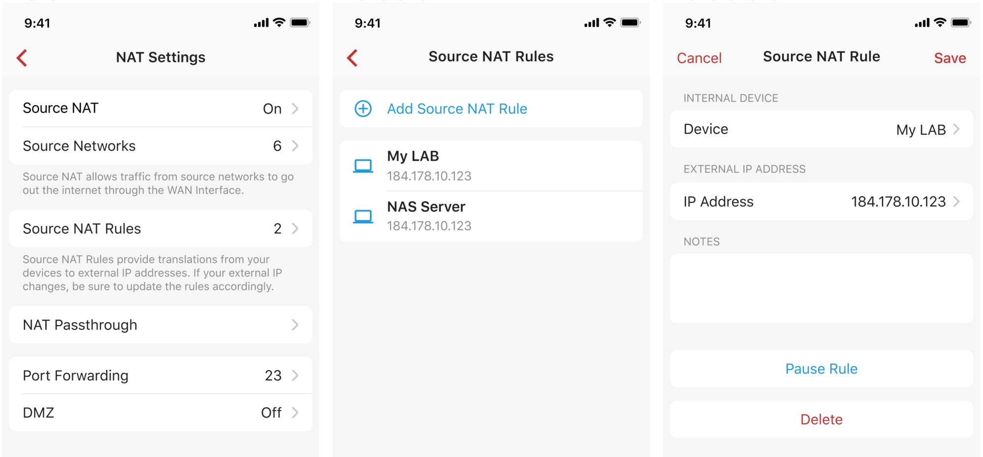 - Configure port forwardings, 1:1 NAT rules, and NAT passthrough