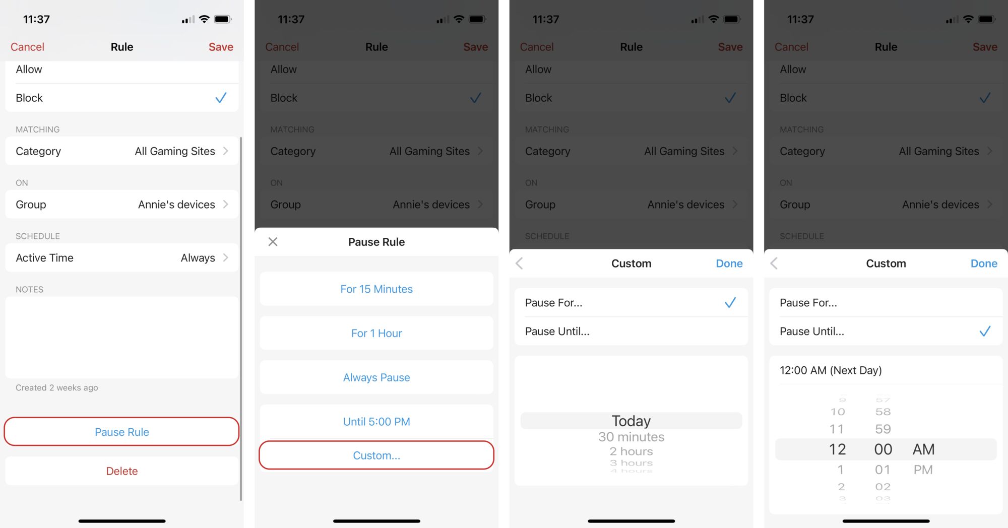 To do this, tap into your rule and scroll down to Pause Rule. You can tap Custom and choose either Pause For... or Pause Until... for a custom pause duration.