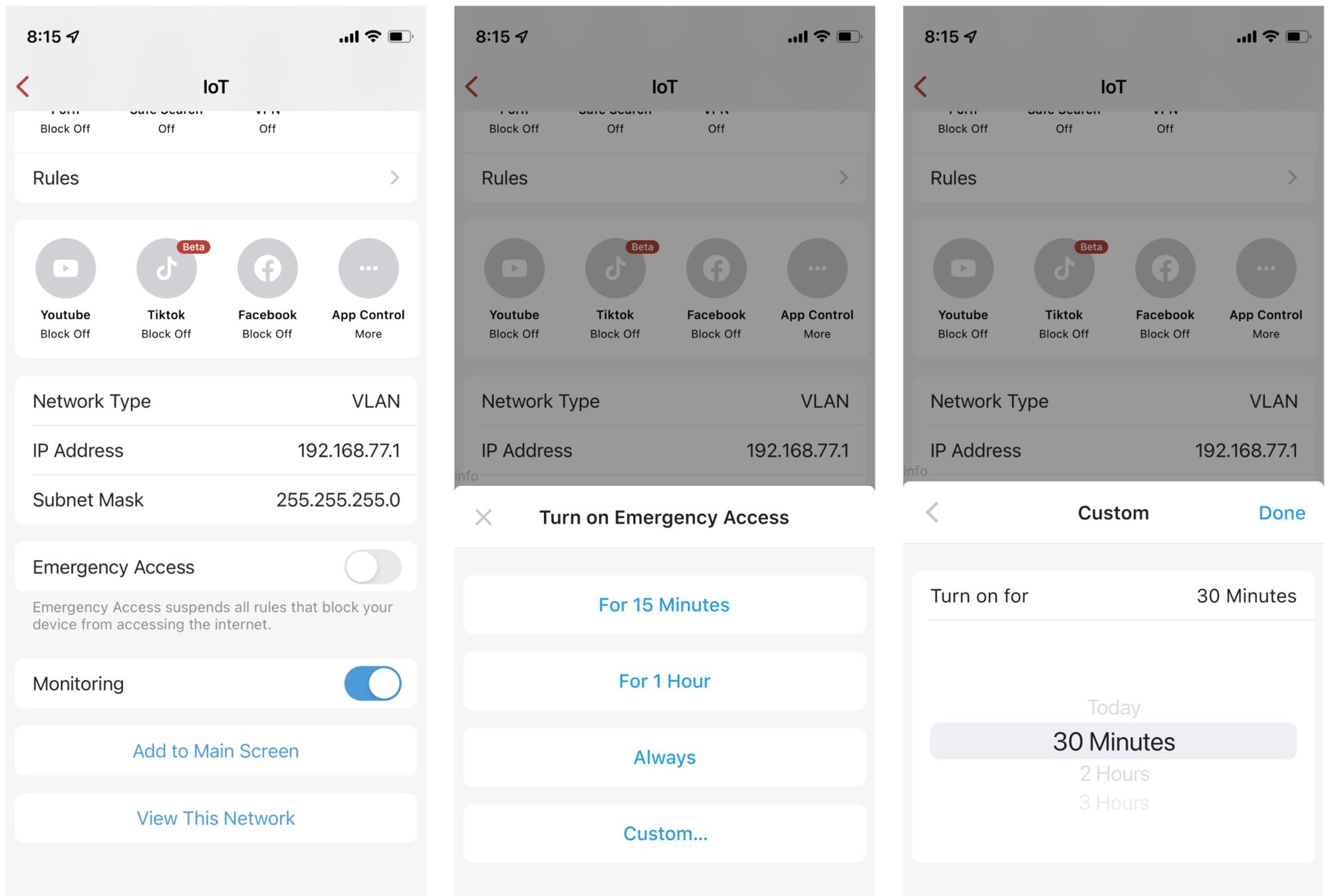 Under each device/network detail page, there is an Emergency Access button that controls whether a device's network access is controlled by Firewalla. You can also leverage this feature to give kids or employees temporary access. Similar to pausing rules, emergency access can be turned on for 15 minutes, 1 hour, always, or for any custom time period.