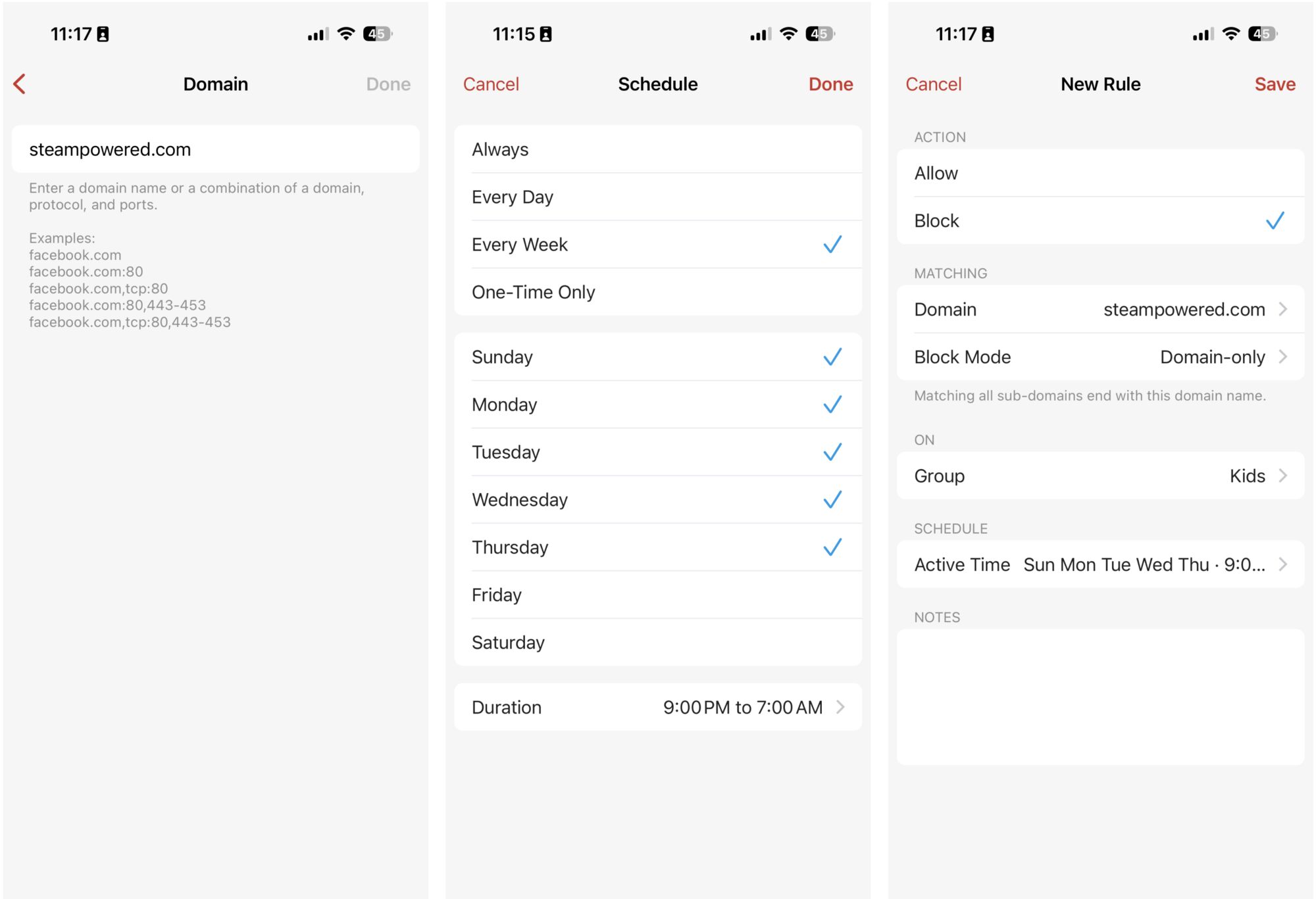 You can also set a schedule for a rule to take effect. This is especially useful if you need to manage internet access based on your kids' screen time rules. For example, if you want to block a device from accessing Steam every week, Sunday to Thursday, from 9 PM to 7 AM, you can create a new rule for this device: