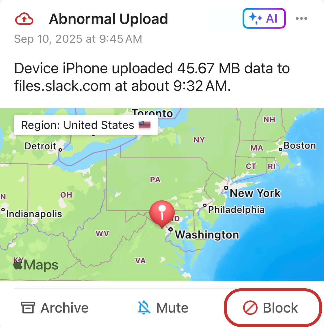 By taking the Block action, you tell your Firewalla system that the activity it has detected is NOT safe and you want to block it in the future. To Block, tap on the "Block" button.