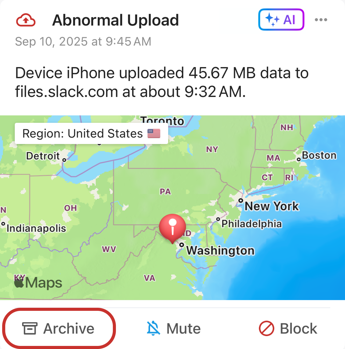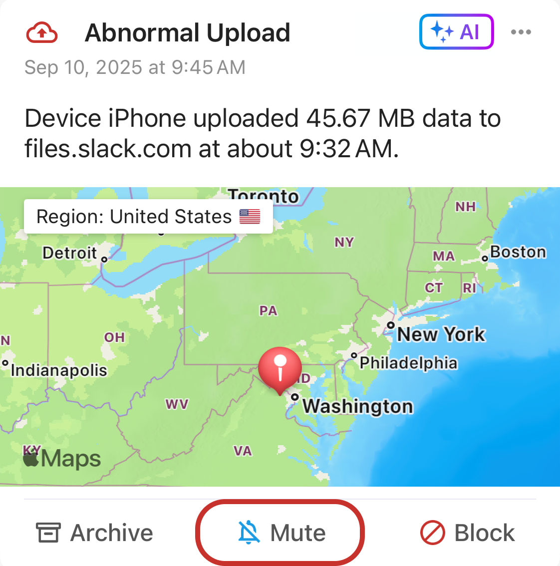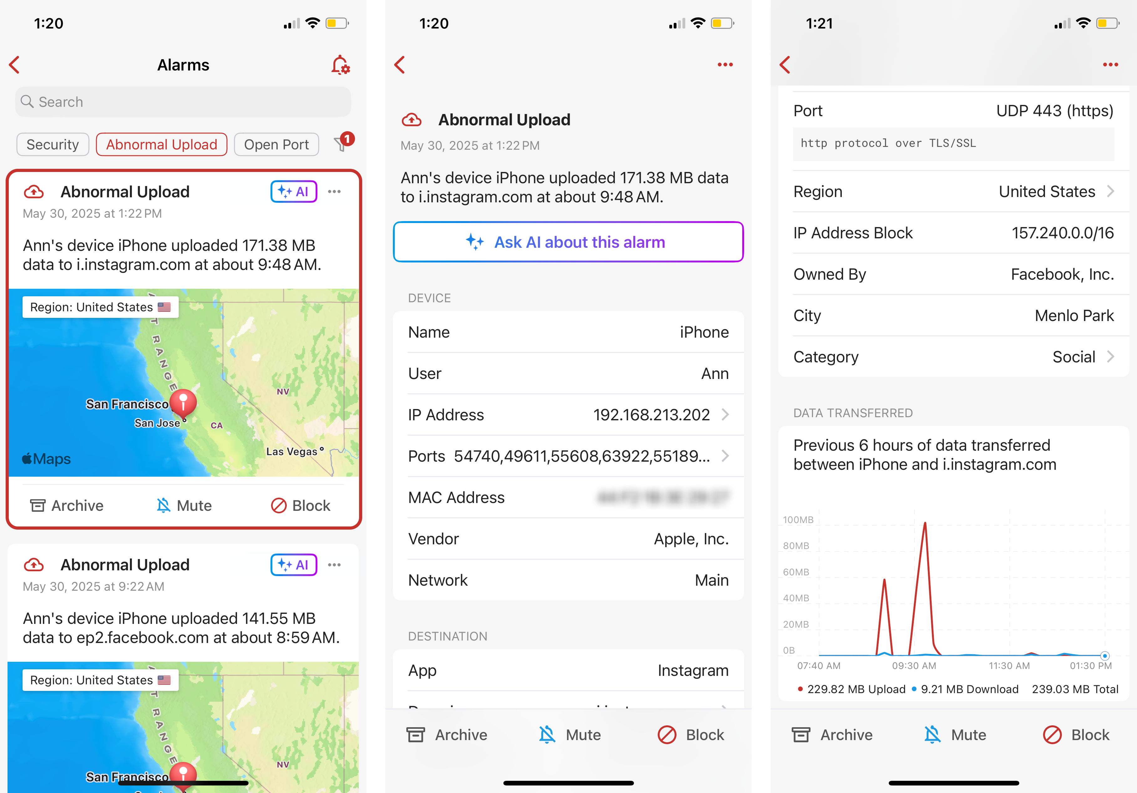 For activity or informational alarms, such as video/gaming activity, device online/offline, Firewalla provides the options to mute/block for the specific device. For security alarms, including abnormal upload alarms, the options are set to mute/block for all devices.