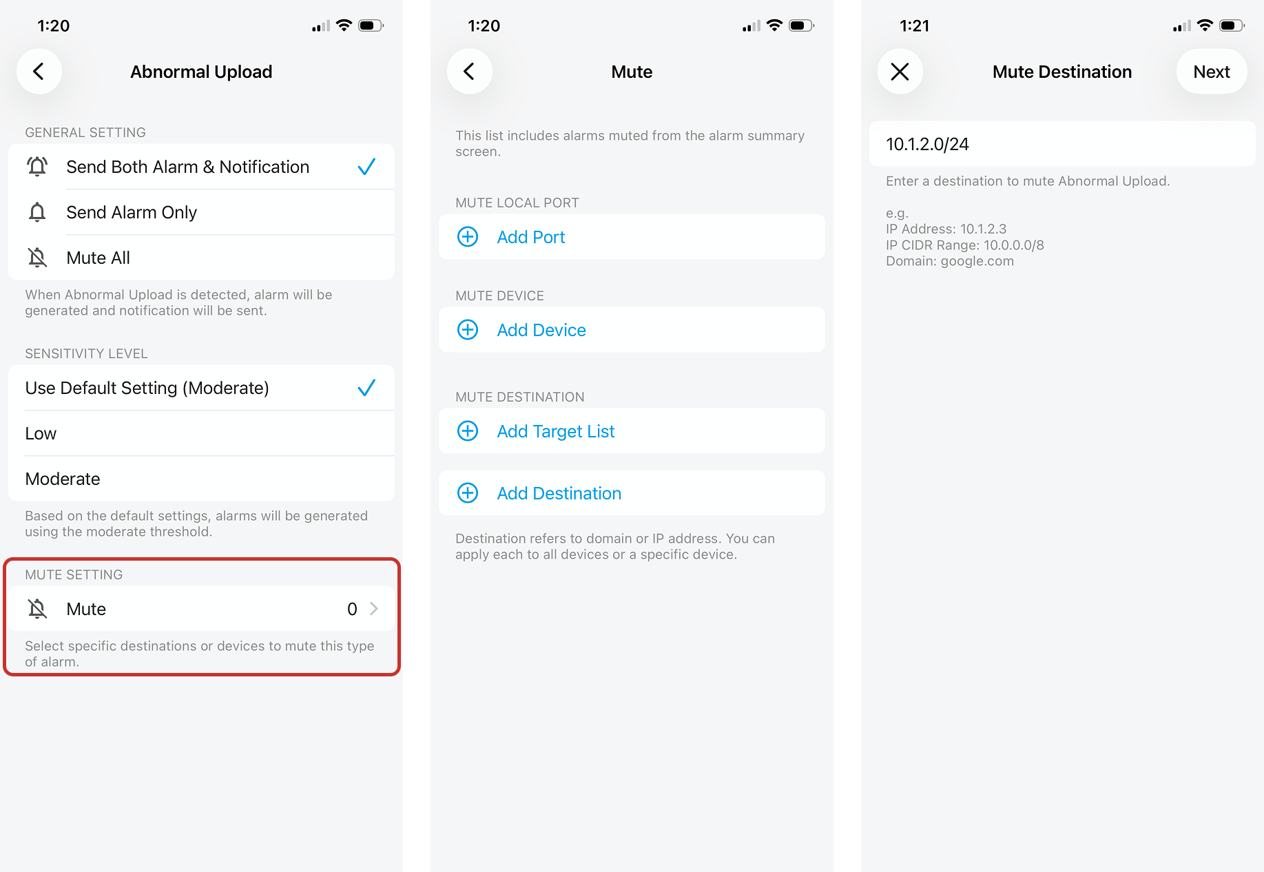 - Mute setting options may vary for each alarm type. For example, muting local ports is only available for Abnormal Upload, Large Upload, and Open Port Alarms. (Muting ports for Abnormal and Large Upload Alarms requires App 1.67 or later)