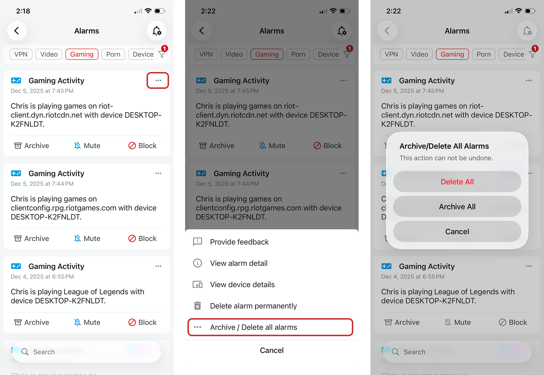 For all Gaming Activity and Video Activity alarms, you can quickly choose to mute the alarms on all devices for 1 hour or until the end of the day. This helps you to temporarily turn off these activity alarms so you don't have to remember to turn them back on. If you want to permanently mute these alarms, tap on "Always Mute" to further configure the action.