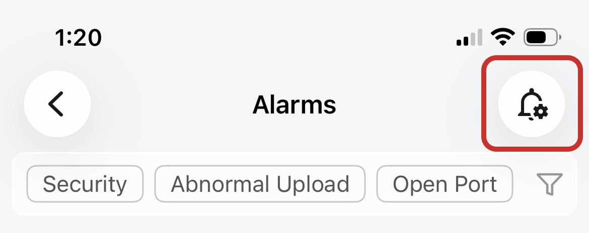 Tap the Alarm icon on your Firewalla box's main page to find a list of alarms from the last 30 days.
