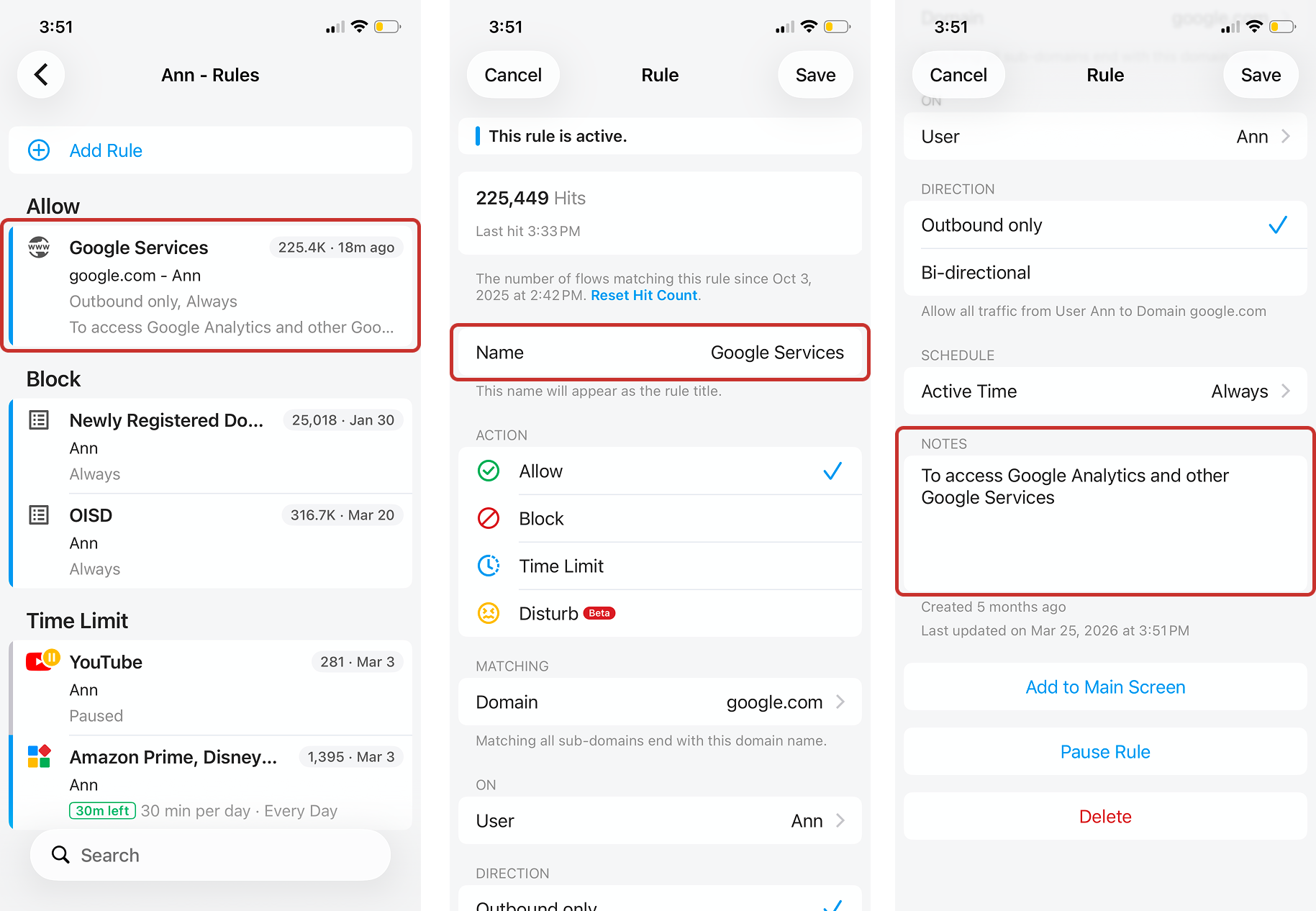 Rules can be created as above, or when you use the control buttons on the device home screen, such as blocking/allowing all gaming sites, a rule will be automatically created and appear on the Rules list.