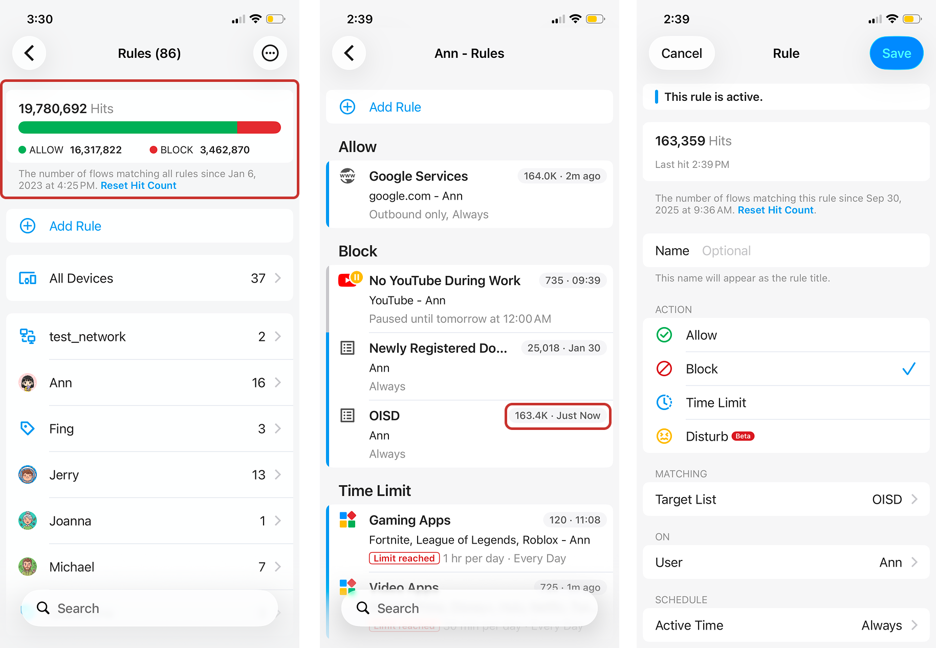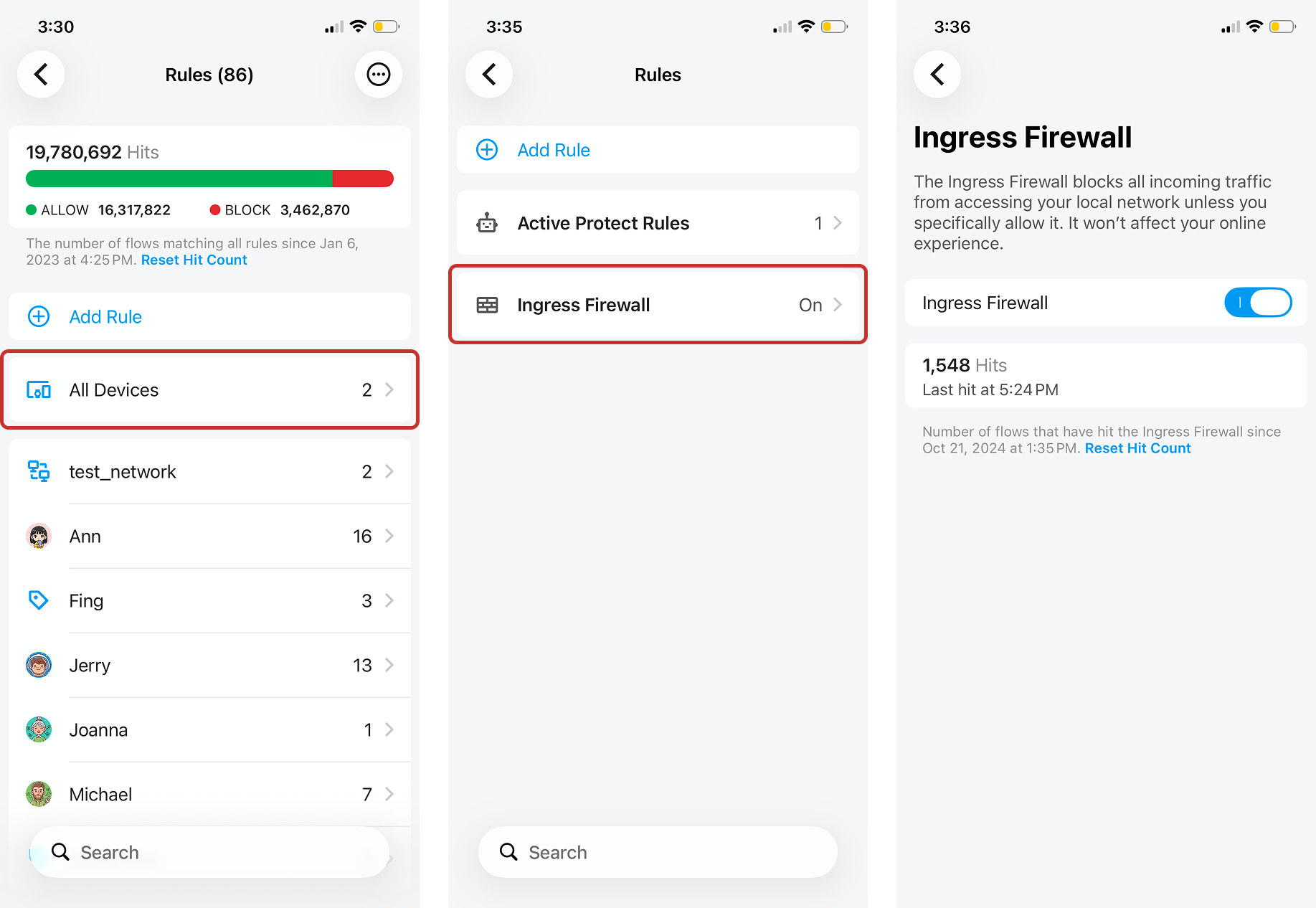 If you tap into a Rules list for a specific device, user, group, or network, it'll also display the individual rule hit count and the last time it was hit. Tap into the rule to see more details. You can tap Reset Hit Count to reset the stats for each rule separately.