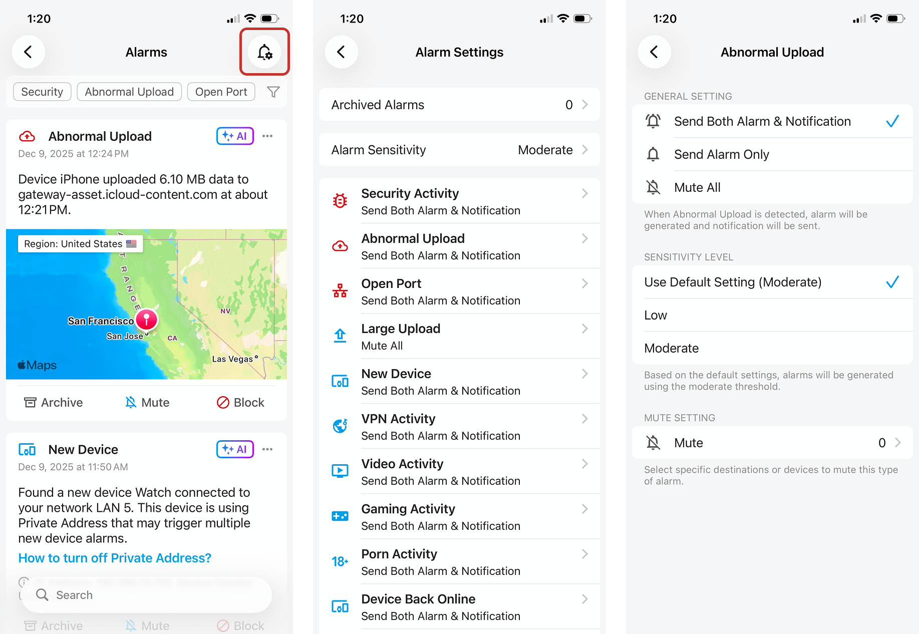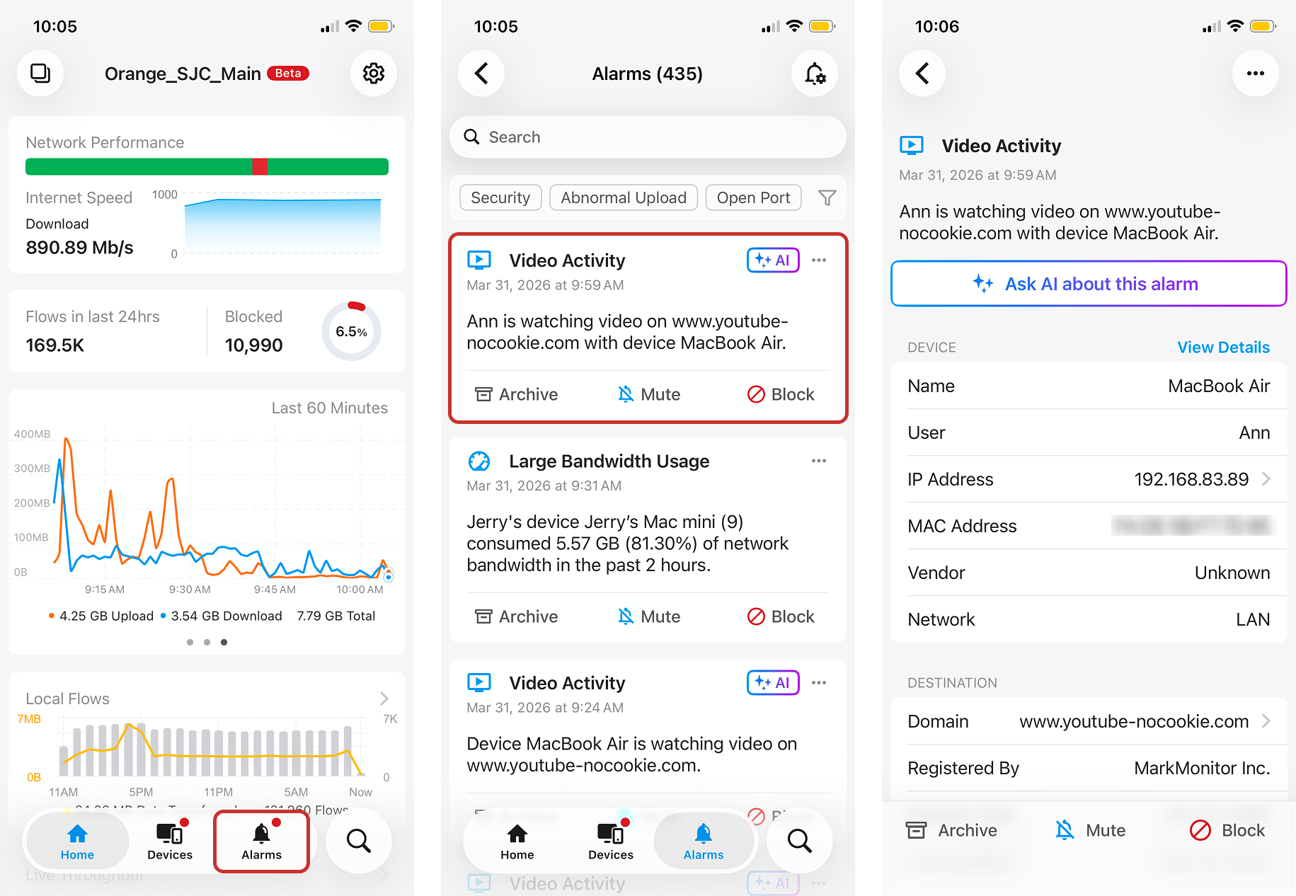 - You might notice that some alarms, such as Abnormal Upload alarms, are slightly delayed from when the activity they're flagging occurred. This is because our alarm detection algorithms need time to run.
