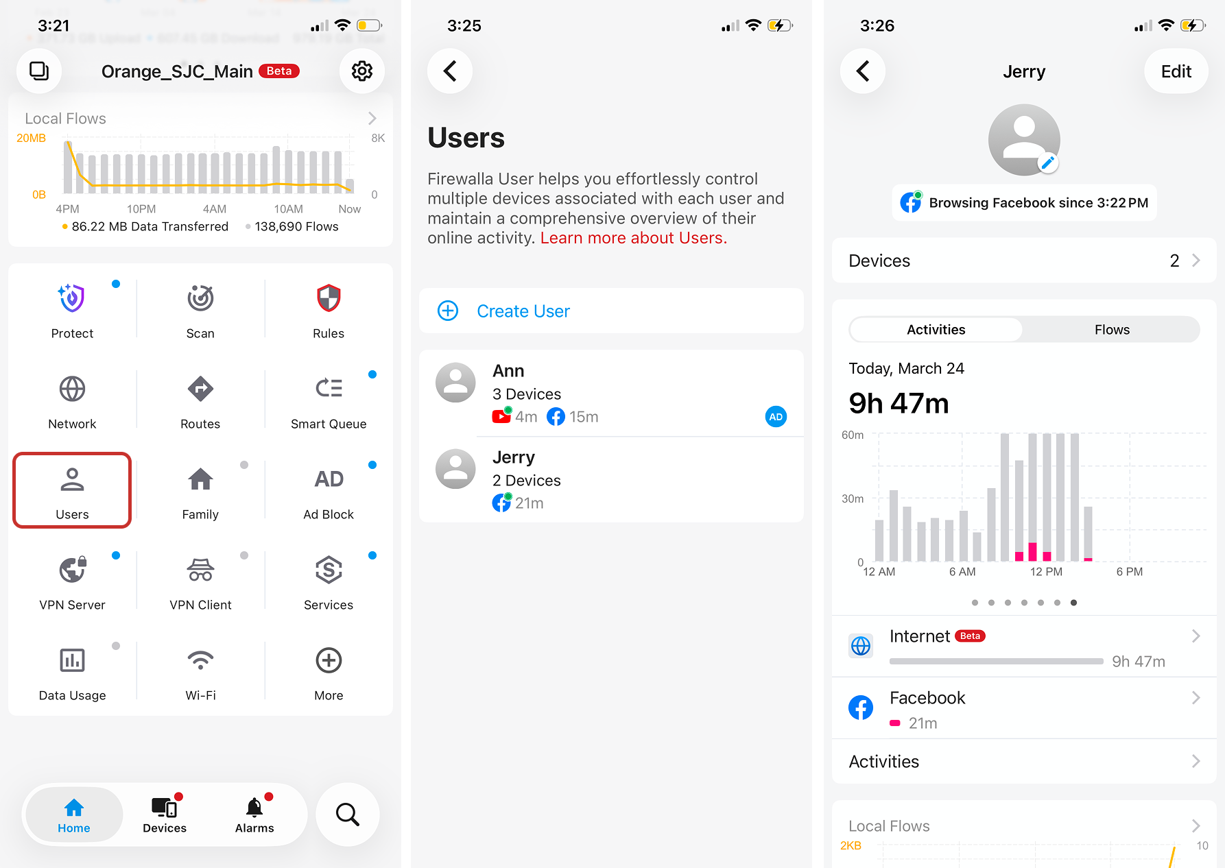 Firewalla's Users feature can show you when, what, and for how long people are watching videos or playing games on your network. Additionally, you can set time limits to control how long a User has access to certain apps.