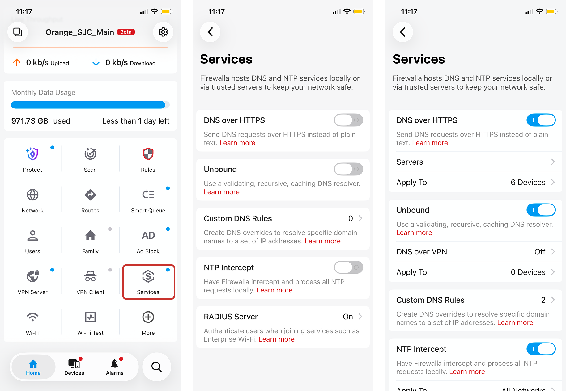 If you're concerned about the privacy of your DNS requests, try turning on DNS over HTTPS (DoH) or Unbound. DoH encrypts your DNS requests, while Unbound is a DNS resolver that can be a more trustworthy alternative to upstream DNS servers. Toggle them on by tapping the Services button on your box's main page.
