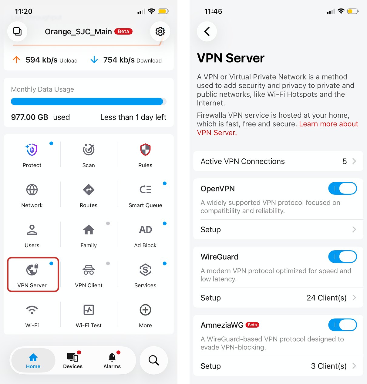 The Firewalla VPN Server keeps you secure by linking your devices back to your Firewalla from anywhere in the world. Just turn it on and start connecting your devices to it.
