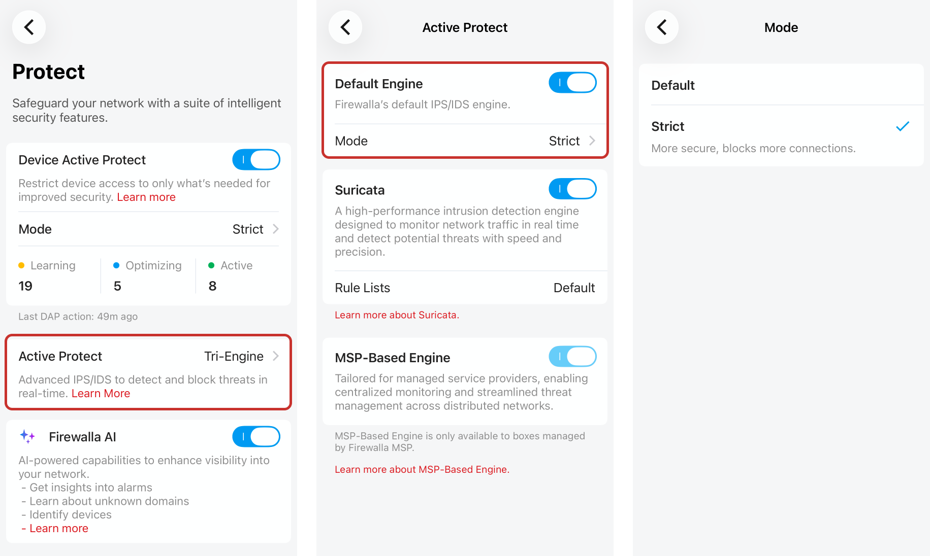 Firewalla offers two different configurations for its built-in Active Protect Engine: Default Mode and Strict Mode. While Strict Mode checks Firewalla's cloud database of security intel more often, this also means it may raise more false positives. However, if you'd like an extra layer of protection, you can turn Strict Mode on by tapping Protect -> Active Protect -> under Default, tap Mode -> Strict.
