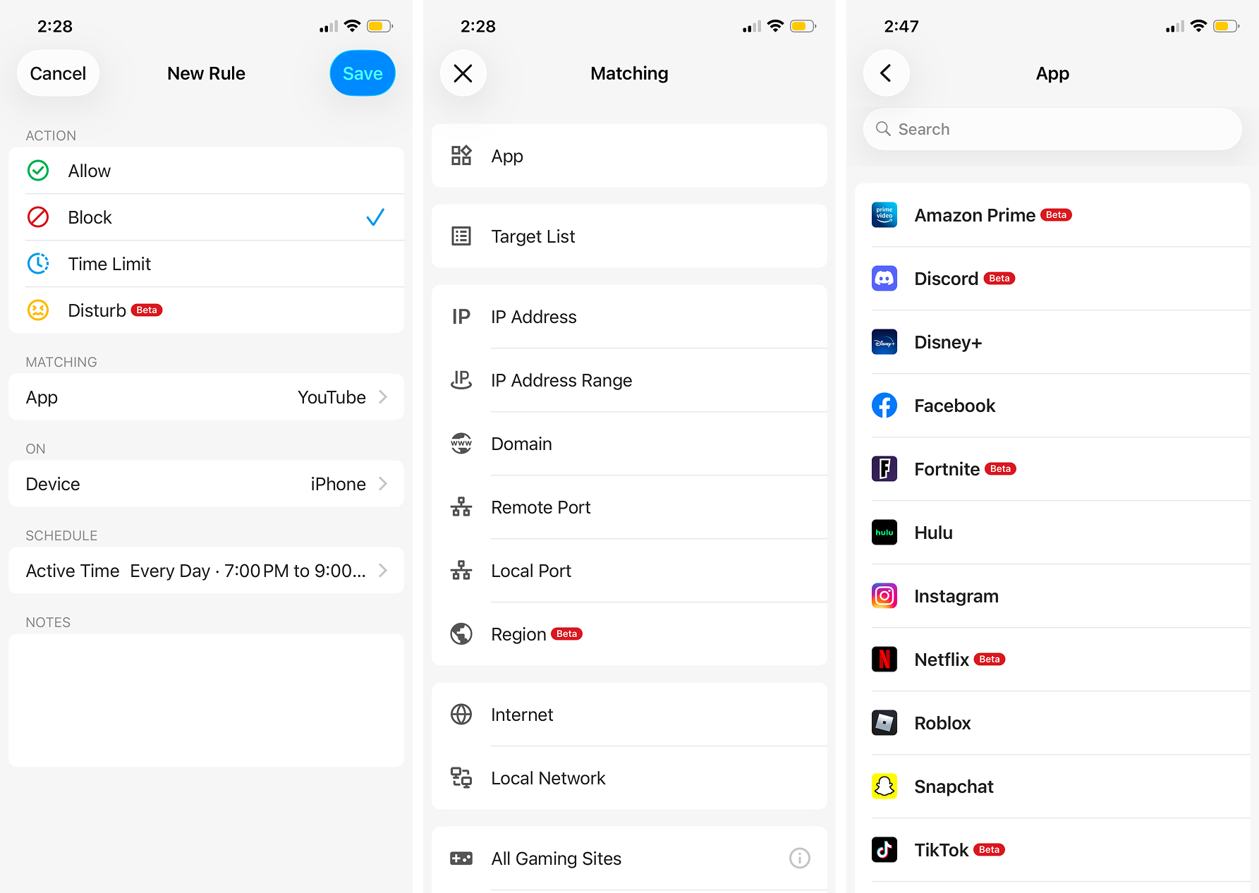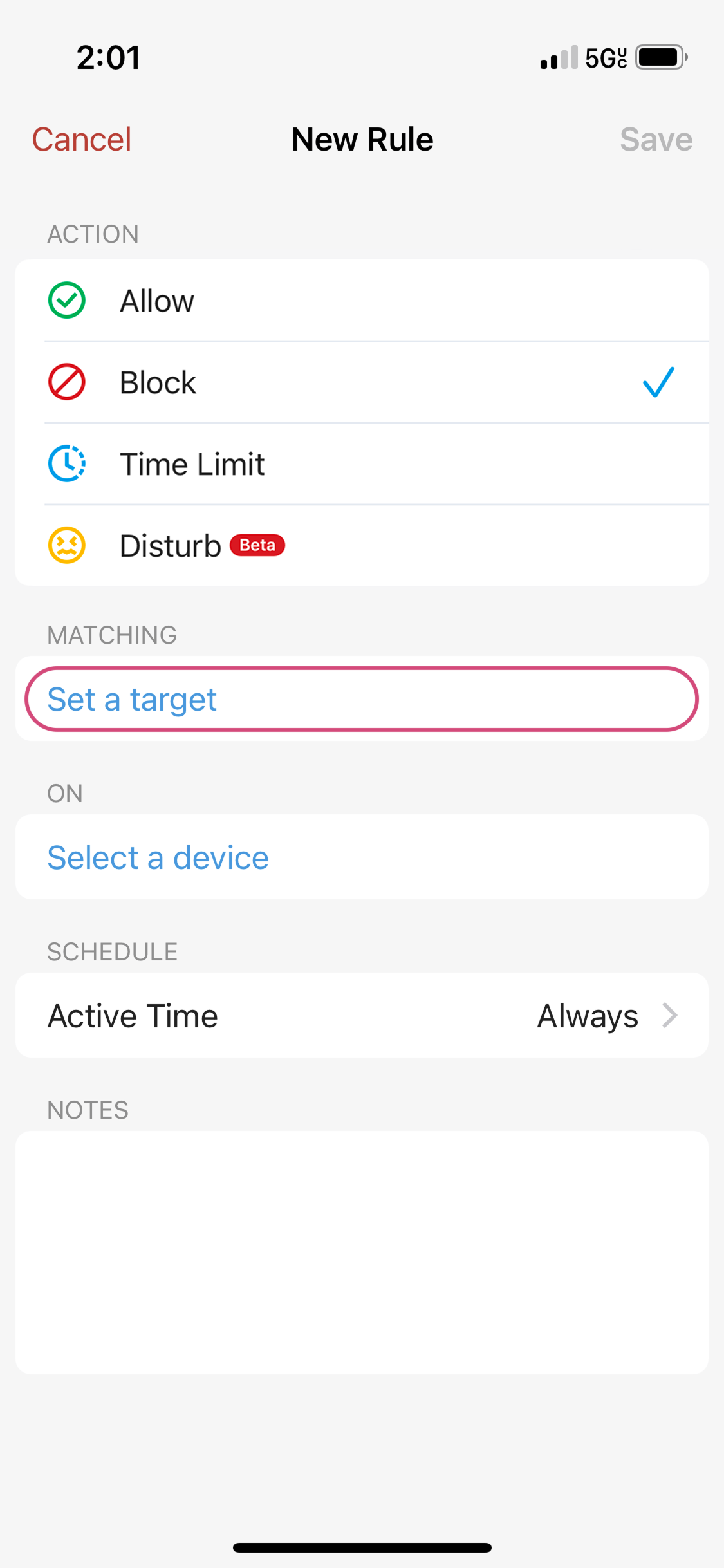If you want to manage access to a certain app (such as YouTube, TikTok, Instagram, etc.), you can use Firewalla's Rules to limit what apps a device or a group of devices may use. To do this, create a new block rule and set the rule target to the app you'd like to block.