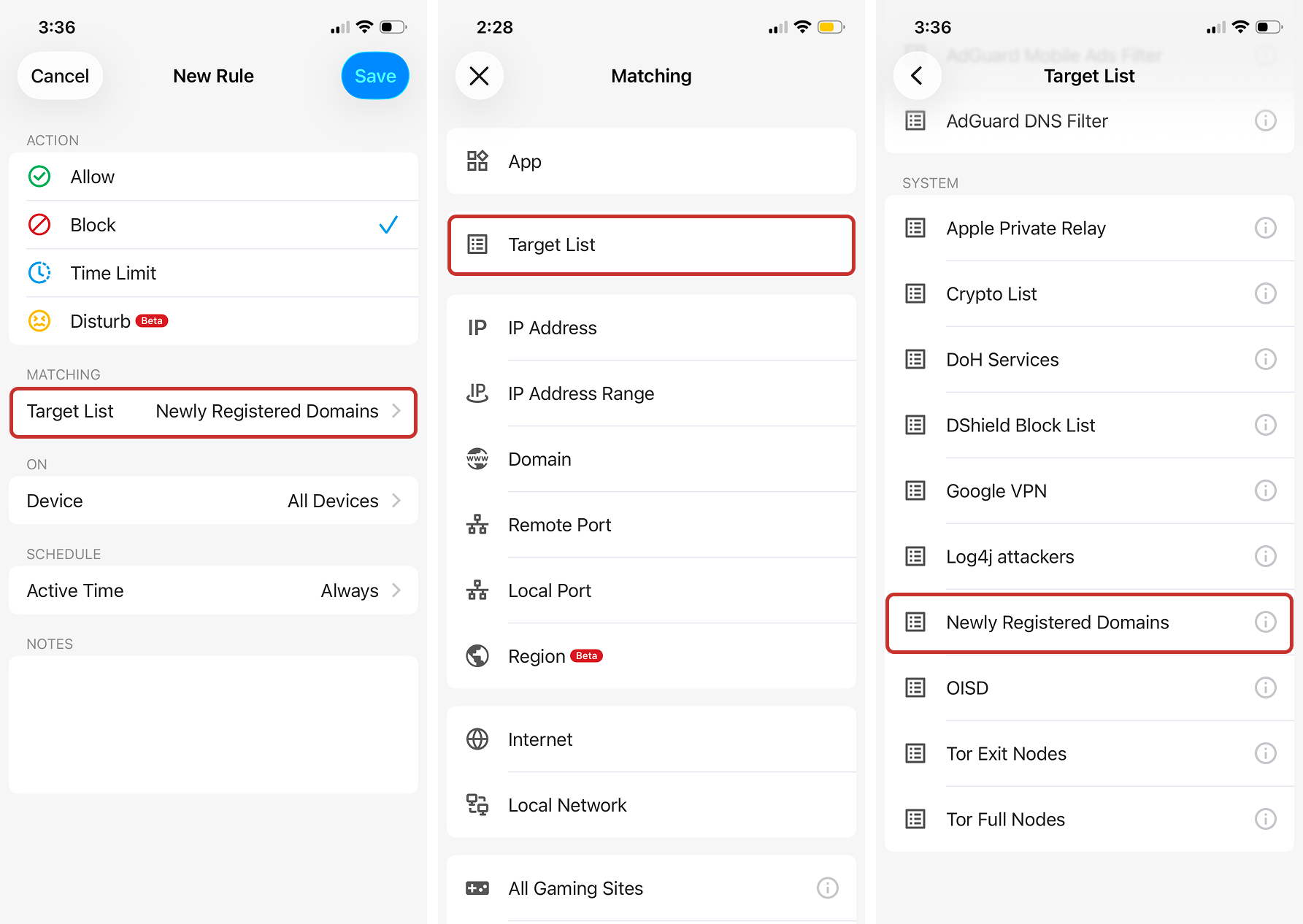 Firewalla has built-in Target Lists that you can use to enhance Firewalla's blocking features even more. For example, you can block Apple Private Relay or DoH Services to ensure that no devices on your network can get around your policies by encrypting their DNS requests. You can also block OISD to block additional risky or unwanted sites, or block Newly Registered Domains (NRD) to block potentially malicious sites that might lack an established reputation.