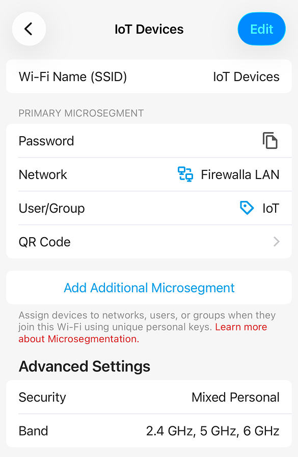 Tap on any SSID listed on the Wi-Fi page, then tap Edit in the top right corner. For each SSID, you can configure the following settings: