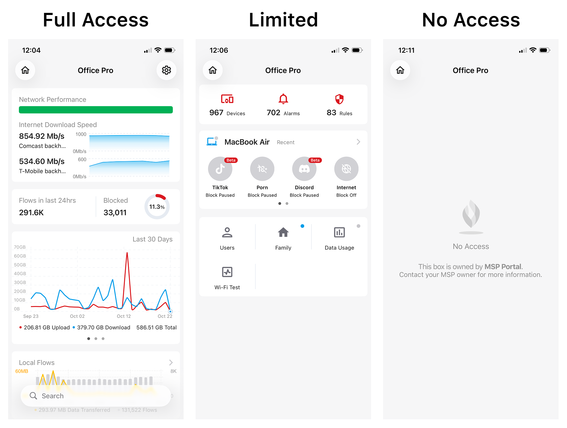 With Firewalla Managed Security Portal (MSP), admins can manage the mobile app access of all devices paired to their box, assign appropriate access levels, and ensure each device only sees what they need in the Firewalla mobile app.