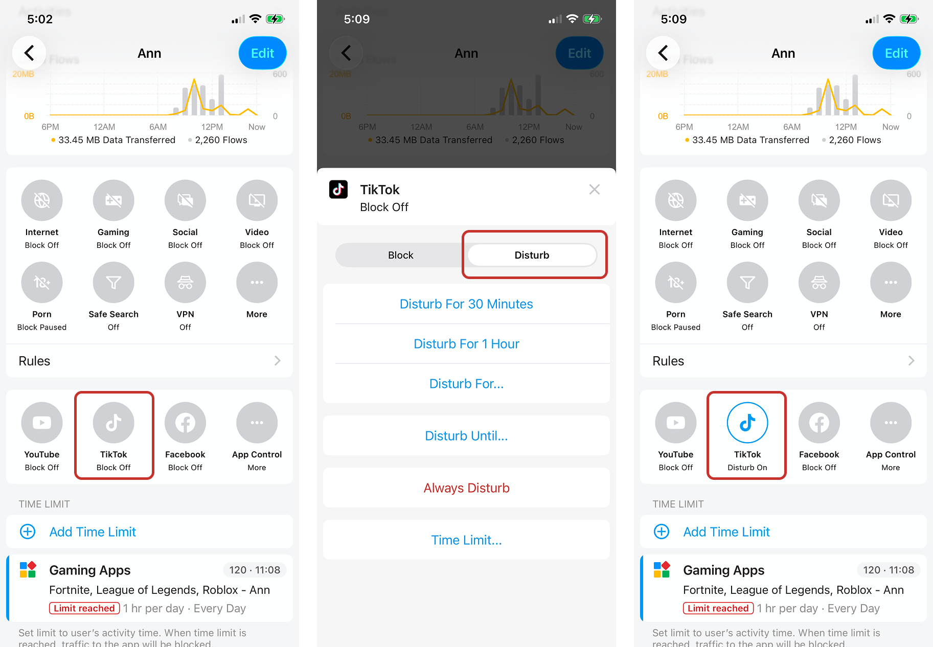 For all Disturb-supported targets (e.g., Internet, Netflix, Roblox, TikTok, YouTube), tap the Control Button and select Disturb.