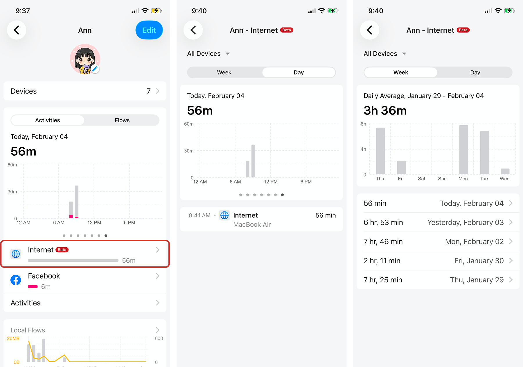 Tap Internet on a User's Activity to see more details on their daily and weekly Internet usage.