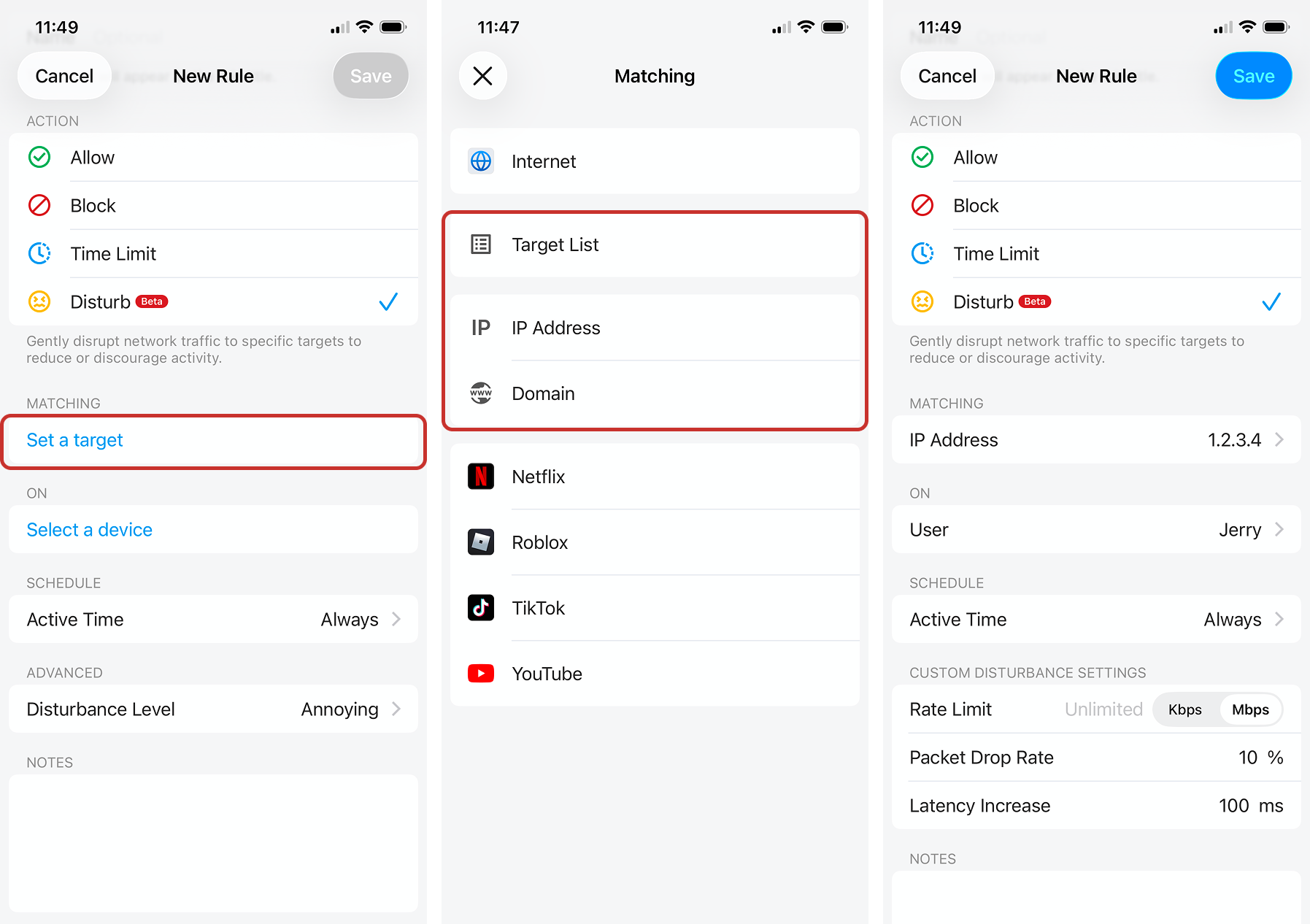 We now support Disturb for Target List, IP Address, or Domain. Similar to Internet Disturb Rules, we only support Custom Disturbance Settings when using these targets.