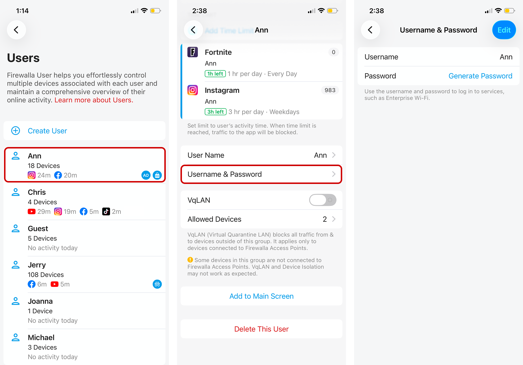 - Then, navigate to each User and set up a Username and Password so they can connect to Wi-Fi.