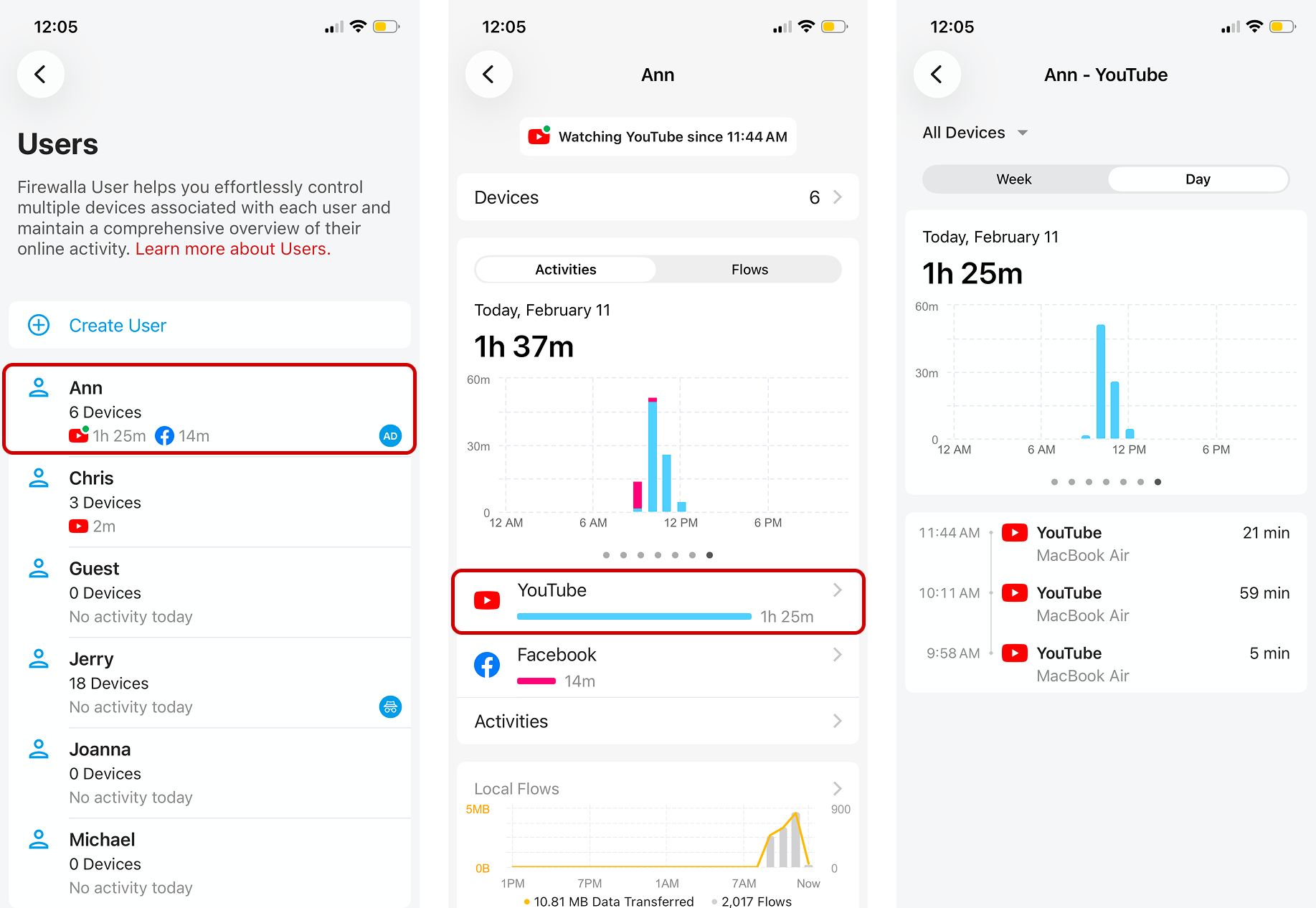Find out how your kids are spending time on the network with our User Activity Tracking. Firewalla can summarize the activity for the day or the week, so you can have a better idea of your kids' daily usage.