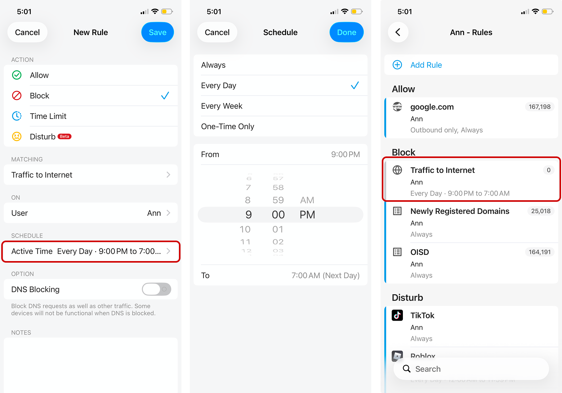 Create a new Firewalla Rule to Block Traffic to the Internet on your kids' devices. Set the Schedule to be active Every Day after 9 PM, so that your kids go to sleep at reasonable times.