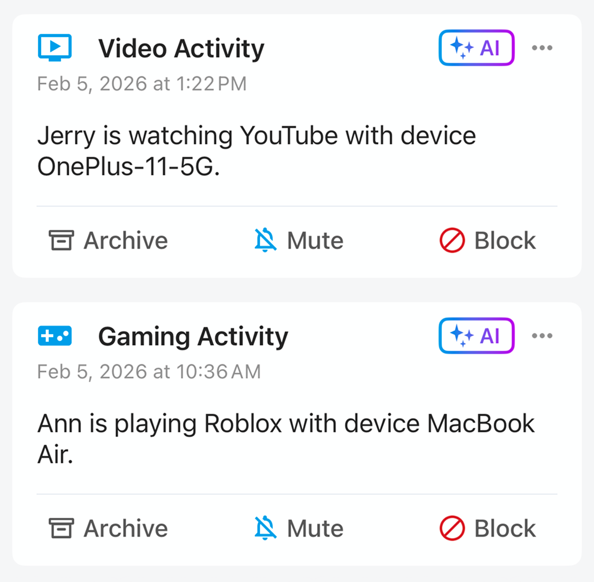 Firewalla will automatically send you Alarms if it detects certain activities, such as playing a game, watching videos, or accessing adult content. You can block or allow the activity directly from the Alarm.