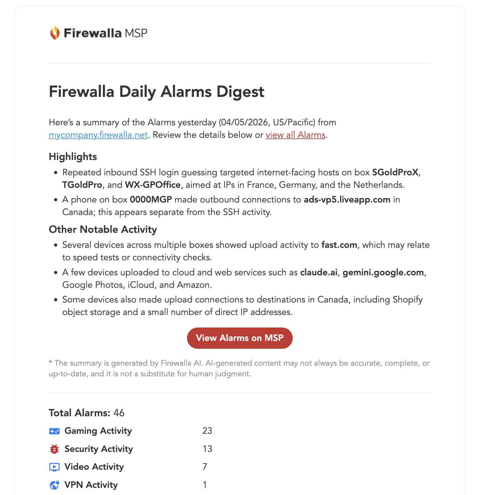 If you have Firewalla AI enabled on your MSP, your scheduled Alarm Summary Digest emails now come with an AI-generated highlights section. Instead of sorting through every alarm yourself, you'll get a quick recap of the things that actually matter: security threats, VPN hiccups, connectivity changes, new devices, and more. Think of it as a smart assistant that reads your alerts so you don't have to.