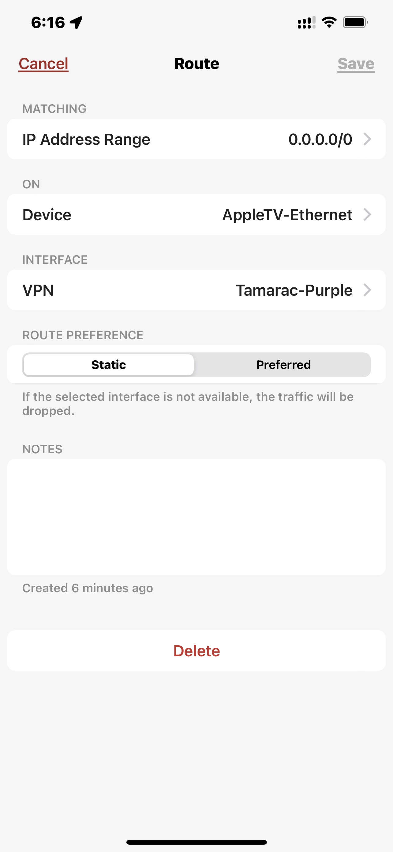 I installed OpenVPN on the iPod-touch, turned on the Tamarac-Purple VPN, and now traceroute shows my traffic (as expected) going through the VPN (10.155.120.1) as expected.