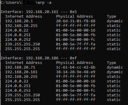 No idea, what this all means, but here are ARP results from the laptop that works on Wired, but fails on Wireless. The wired connection (20.161) matches what I get on a machine that is working fine. You can see the wireless (20.186) results are not right/different.