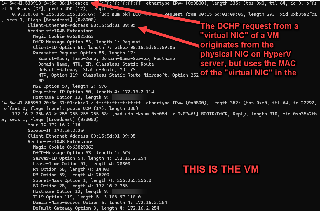 It's important to note that *both* the Hyper-v host and the VM IP addresses (172.16.2.114 and 172.16.2.163) were assigned by the Firewalla router in response to separate DHCP requests.    The following screen shots are the tcpdump output from the Firewalla router showing DHCP request for the Hyper-v server a VM.
