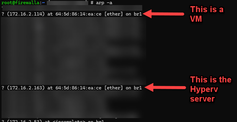 SSHing to the firewalla router and dumping the ARP cache shows that on a Hyper-V host, the MAC address for the physical NIC on the HyperV server *and* for the IP addresses of the VMs.