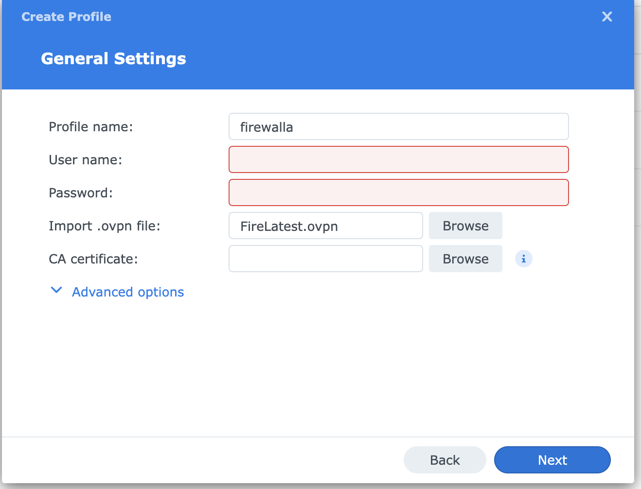 I'm trying to connect to the vpn server running on my firewalla red box using the Synology NAS but synology is asking for a username and password.