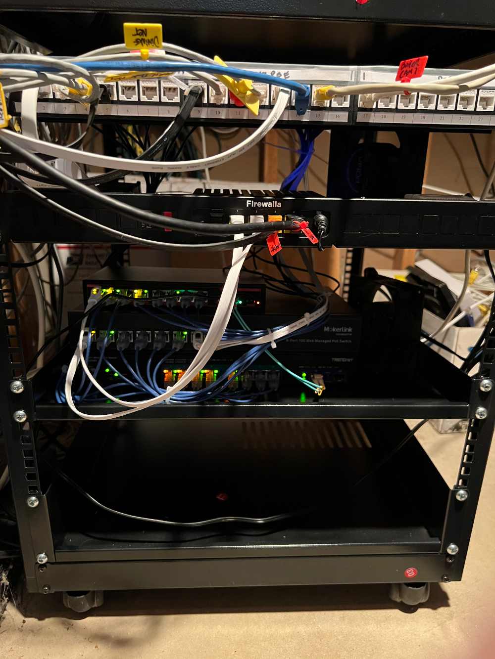 Across the top is a 24 port keystone patch panel. These lead to three separate network switches, all 2.5G or greater. Two are 8 port managed POE, one is a simple 8 port unmanaged switch.