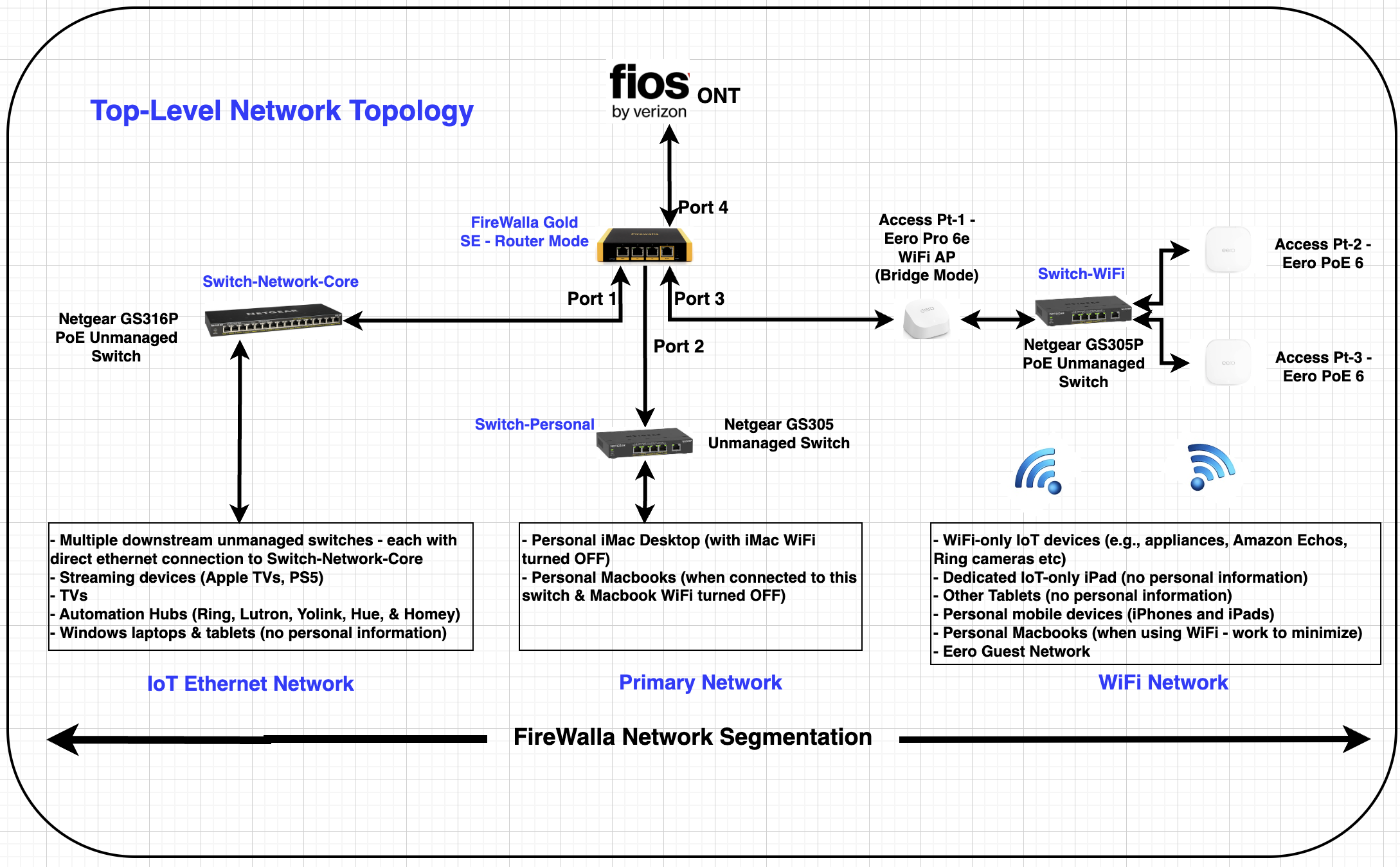 Additionally, I would suggest introducing another cheap AP for those WiFi-only IoT devices in IoT network. Make IoT network for IoT and WiFi network for personal device only. iCloud encryption, like iCloud private relay, can't really restrict local access but hides things from being seen by your Gold SE. Firewalla protection won't fully work on those Apple devices.
