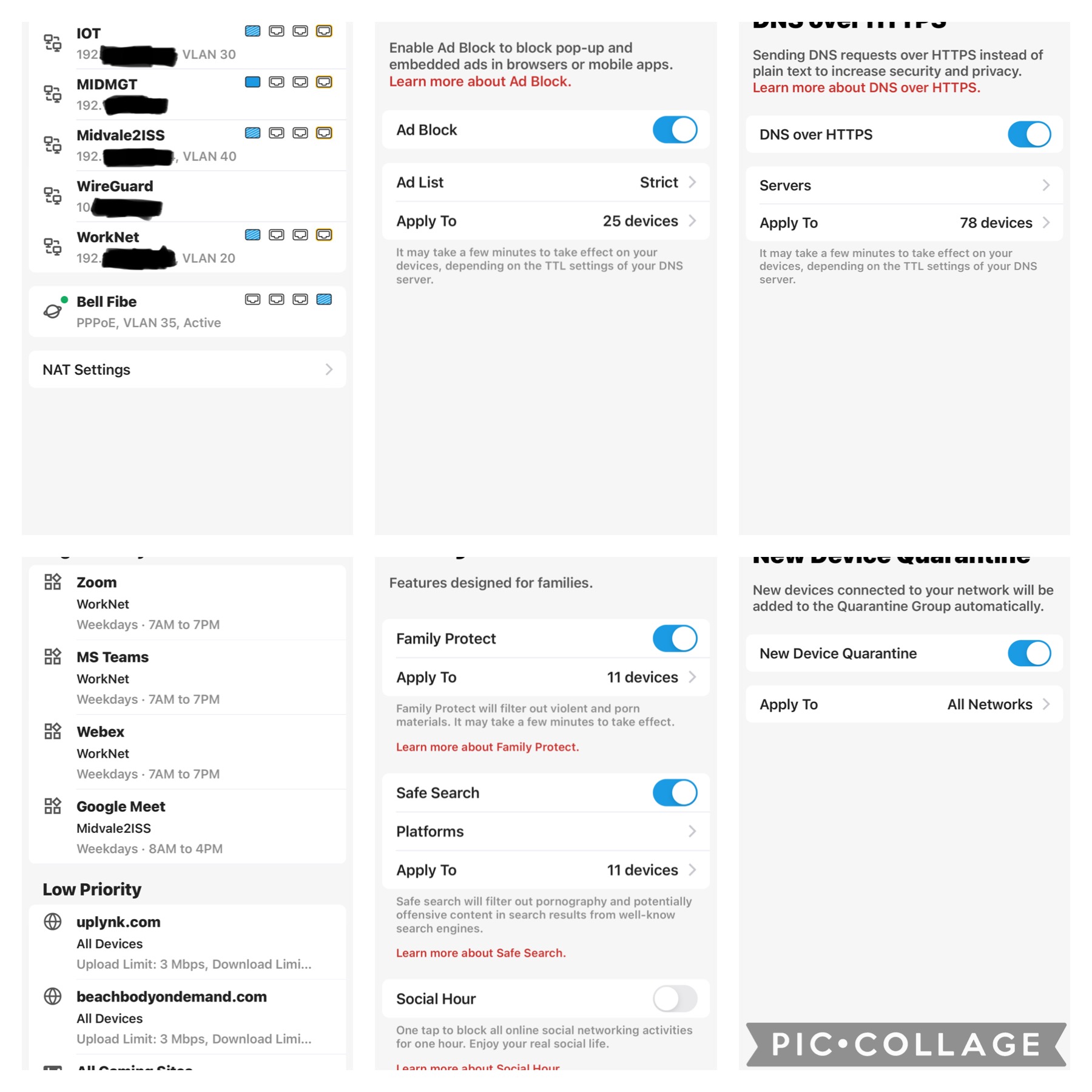 I wanted to showcase what I've implemented in the Firewalla product (collage pic). The VLAN configuration, Ad blocking, Secure DNS over HTTPS, rate limiting/traffic priority, Family Protect/Safe Search and Quarantine features are all in full use to name a few. The VPN server also keeps us cyber safe when connecting while mobile, particularly using unsecured wifi or through cellular service.