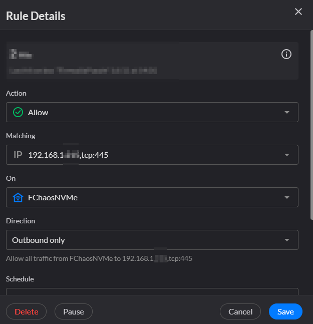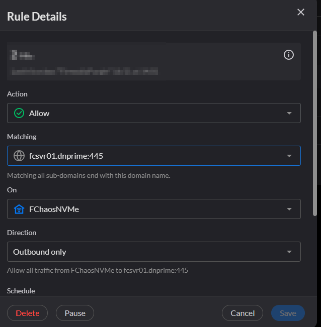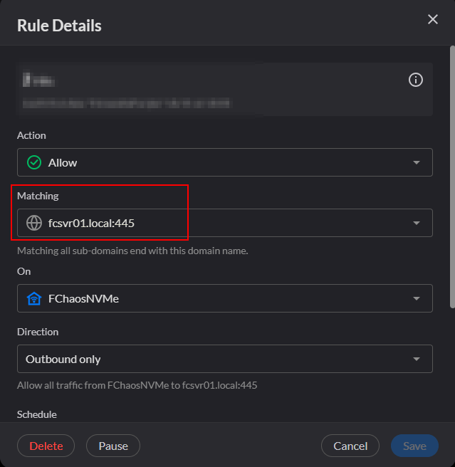 None of the Allow rules I have tried allow me to use the file server device name as its domain name for a rule so I have had to default to entering an IP address instead 192.168.1.***,tcp:445.