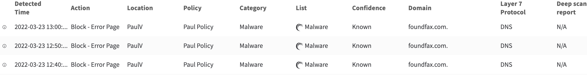 Thanks for the response. The service I'm using is a DNS security service. So it is blocking the connection to foundfax.com ....I guess you would say via the DNS Lookup. Firewalla is NOT doing anything except sending the request to foundfax.com. Again...since nothing is connected to FWG, FWG must be initiating the request. Below is the error I get in an email. Below that is a screenshot of the error I see when logged into the service (not much more info). I checked with Akamai team as well as found info via google. It is malware and ETP (Akamai) is stopping it but how do I get to the source of the issue?