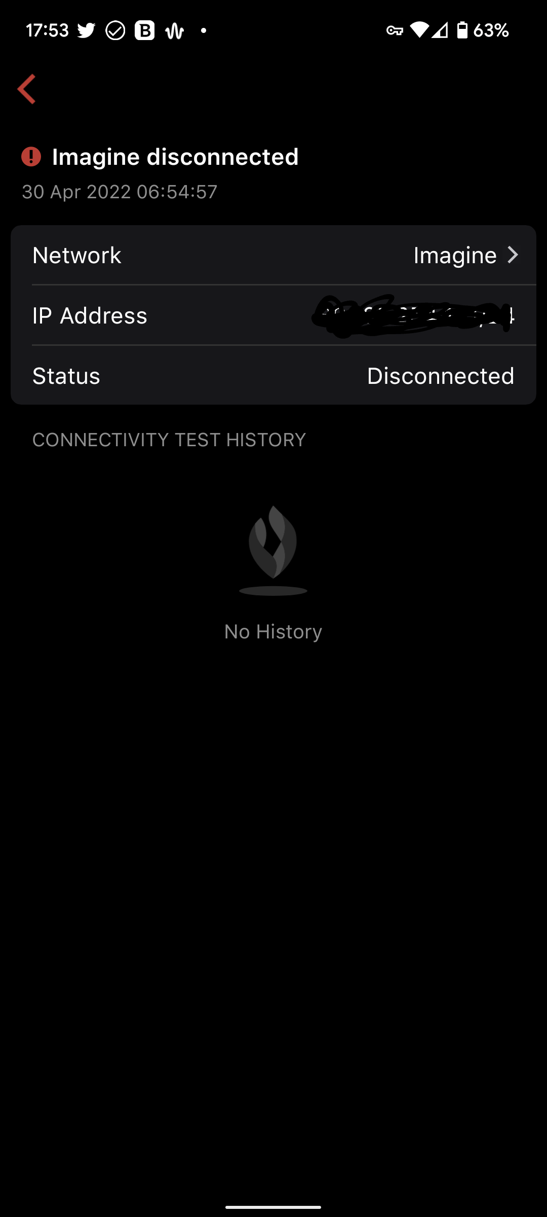 The (i) button only give me Network Name, IP address and Status nothing else - connectivity test history is blank.  It remained steady last night so I'm hoping it was a once off issue.